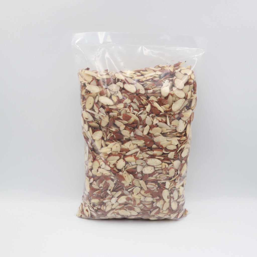 Delgadas láminas de Almendra Con Cutícula de color blanco y sabor característico a almendra, empleada en Repostería como Decoración o para Añadir Textura, también es consumida como Snack.