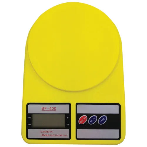 Báscula digital con dimensión de 1 a 10 kg en color amarillo.