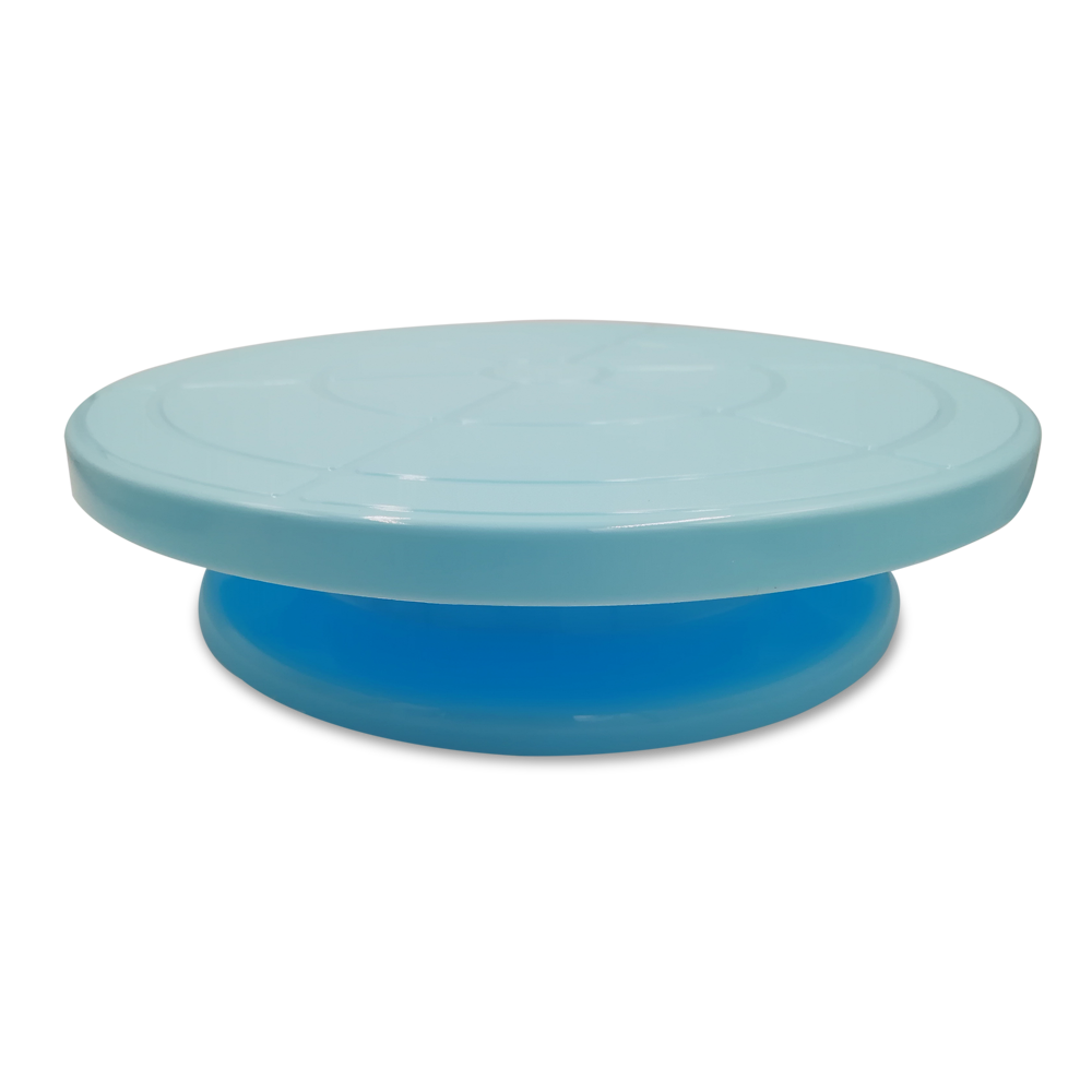 Base para pastel Giratoria de Plastico en color Azul, ideal para decorar pasteles. Cuenta con Dimensiones de 7 cm de Alto x 28 cm de Diámetro.