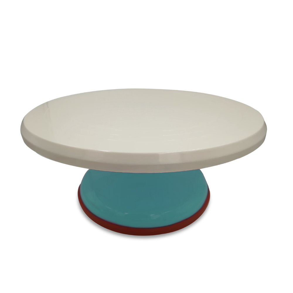 Base para pastel Giratoria de Plastico en color Azul, ideal para decorar pasteles. Cuenta con Dimensiones de 13 cm de Alto x 31 cm de Diámetro.
