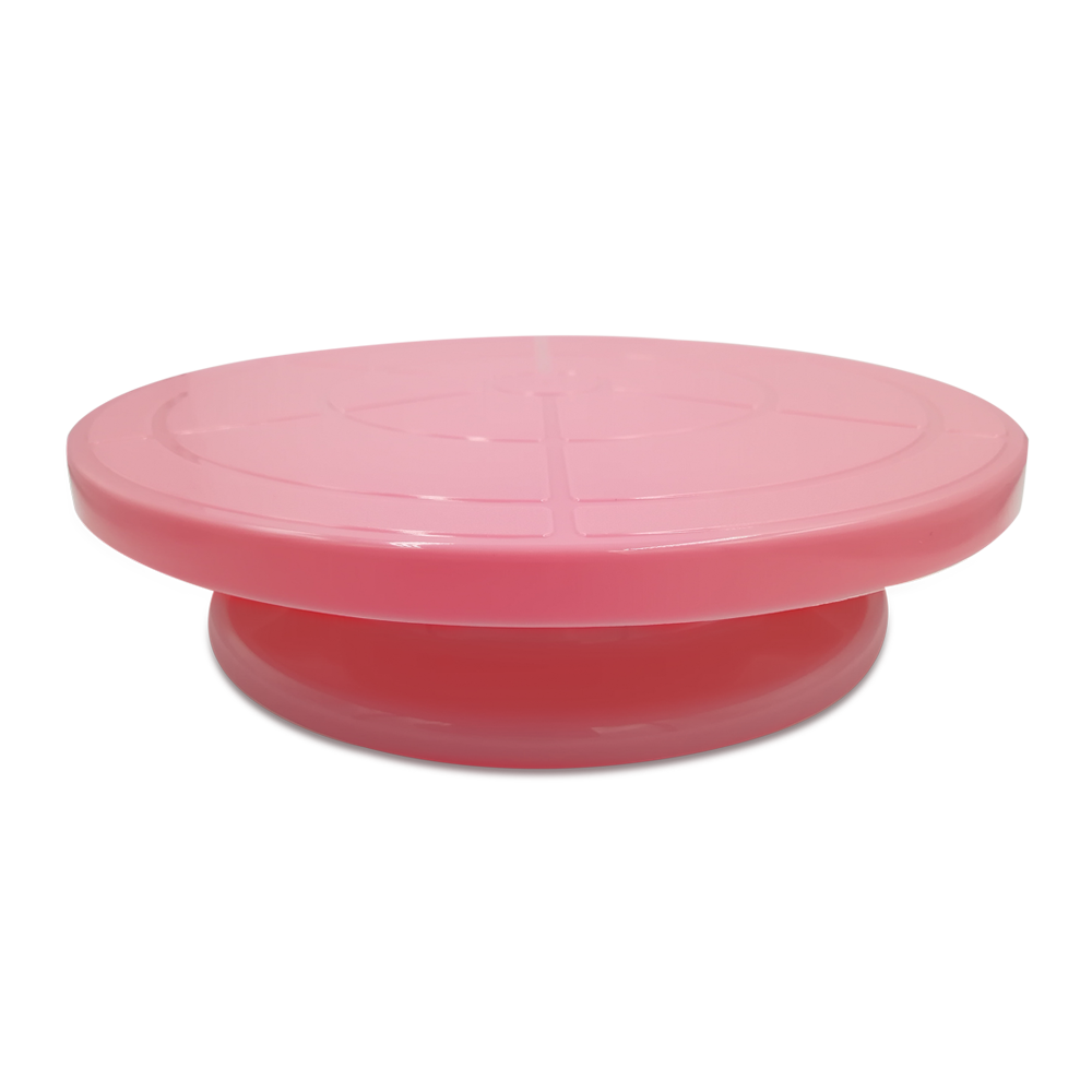 Base para pastel Giratoria de Plastico en color Rosa, ideal para decorar pasteles. Cuenta con Dimensiones de 7 cm de Alto x 28 cm de Diámetro.