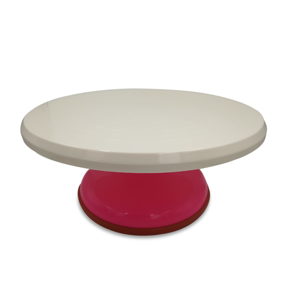 Base para pastel Giratoria de Plastico en color Rosa, ideal para decorar pasteles. Cuenta con Dimensiones de 13 cm de Alto x 31 cm de Diámetro.