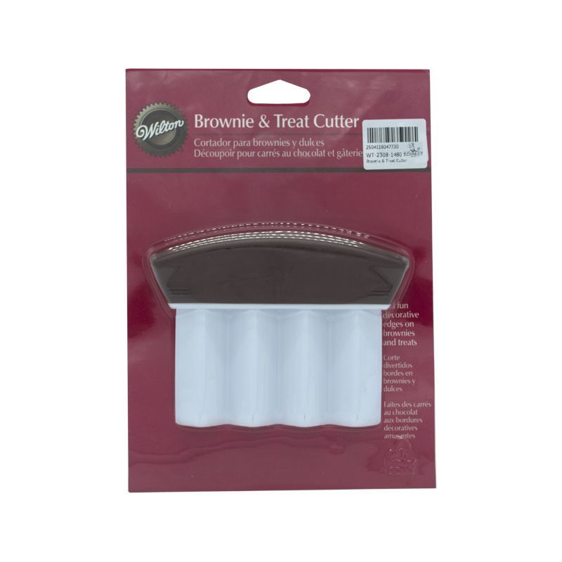 Corte los bordes decorativos de los brownies con el cortador para brownies y golosinas de Wilton. La cuchilla de polietileno evita rayar la sartén.