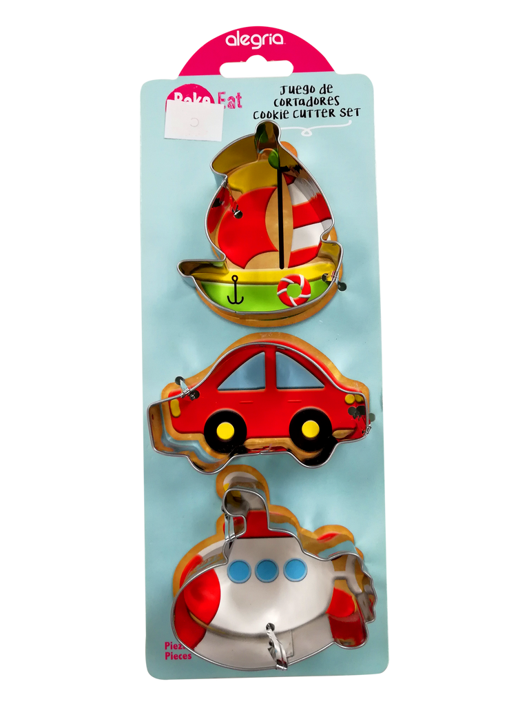 Set de cortadores con diseños de: barco, automovil y submarino. Ideal para galletas, fondant o pasta goma.