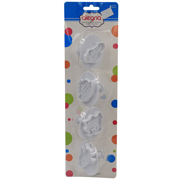 Set de 4 cortadores con 3 diseños distintos: coche, barco, tren y avión. Ideal para galletas, fondant o pasta goma y crear diseños únicos.