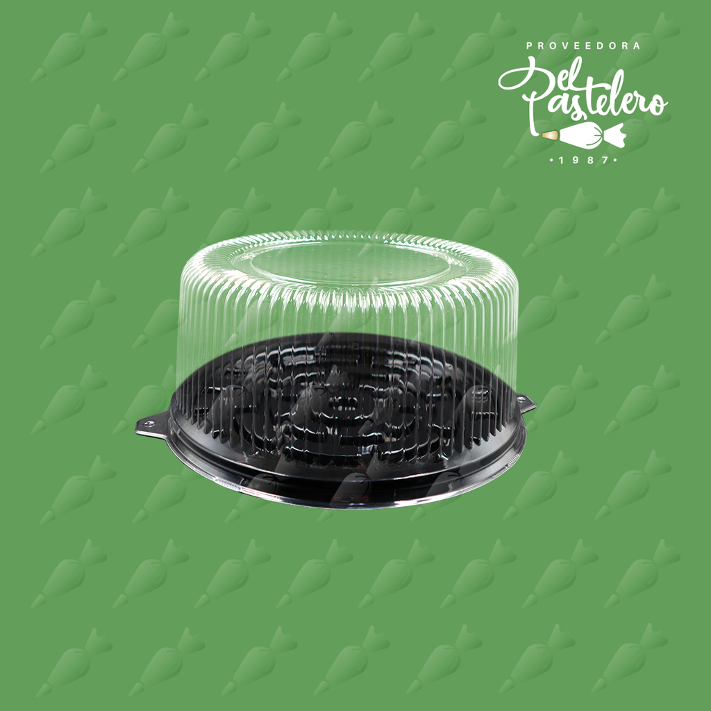 Domo para Pastel 70 Tradicional. Ideal para Transportar y Presentar tus creaciones de Repostería.Medidas: Diámetro: 18.5cm Altura: 10cm.Color: Transparente con Base Negra.Material: Poliestireno.Presentación: Caja con 100 juegos.
