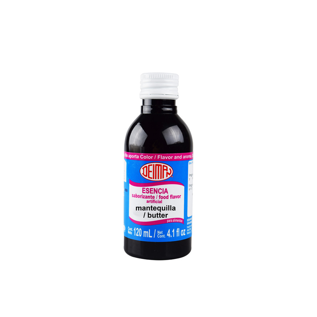 Esencia liquida a base de alcohol sabor mantequilla, imparte sabor y aroma, no imparte color,perfecto para bebidas, fríos, congelados, gelatinas, flanes y lácteos.