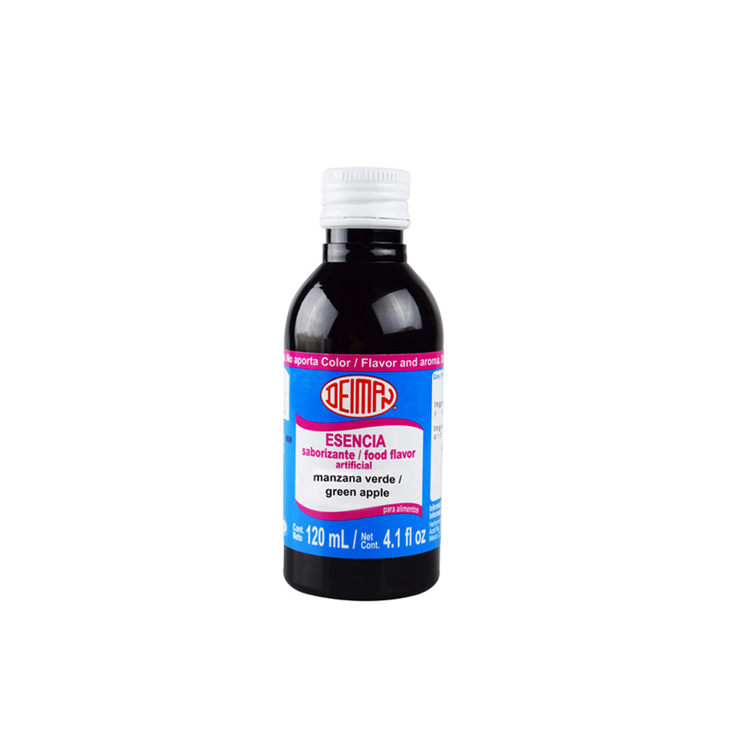 Esencia liquida a base de alcohol sabor manzana verde, imparte sabor y aroma, no imparte color,perfecto para bebidas, fríos, congelados, gelatinas, flanes y lácteos.