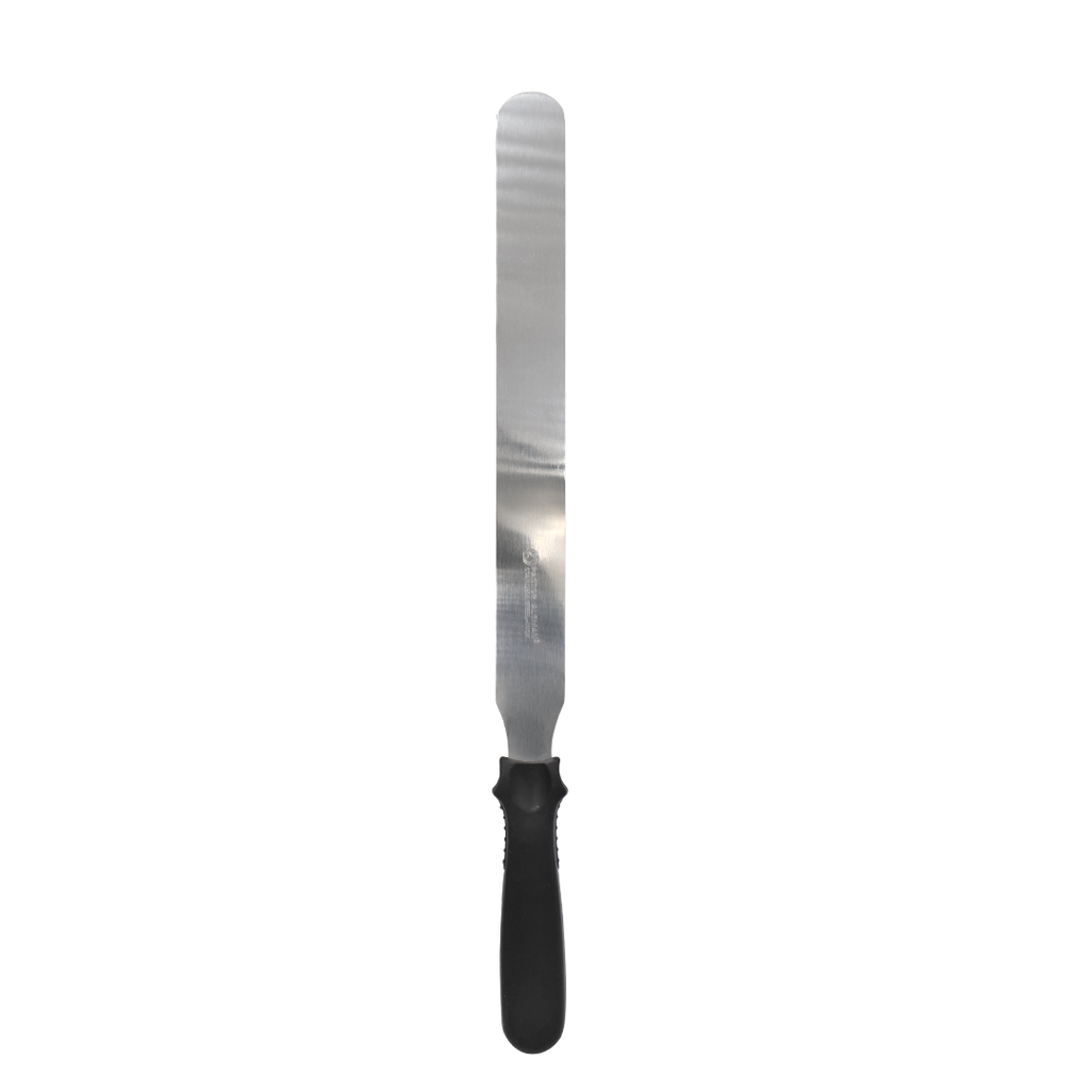 Espátula pastelera, con hoja de acero inoxidable, con mango en color negro, diseño ergonómico, ideal para todo uso, fácil de usar y limpiar.