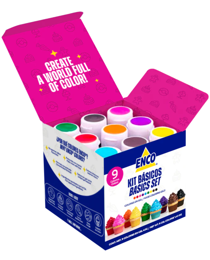 Este increíble kit incluye 9 Colores en gel: Amarillo Limón, Rosa Brillante, Azul Brillante, Naranja, Rojo Rojo, Morado, Verde Hoja, Café Oscuro y Súper Negro.