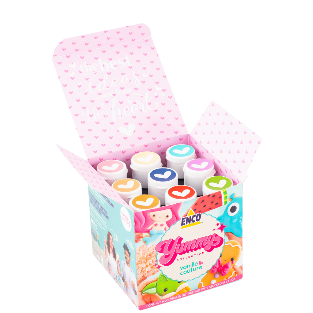 Kit de 9 Colores en gel, hecho en colaboración con Lili Cuéllar y Willie Soto de Vanille Couture. Decora y dale color a tus creaciones de repostería y pastelería con los colores: