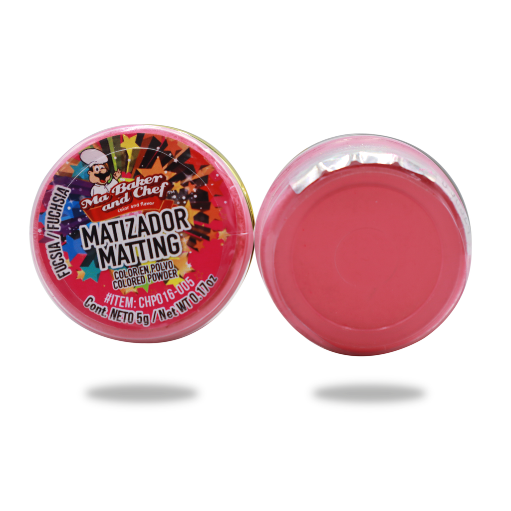 El Matizador en Polvo de Ma Baker and Chef lo podrá utilizar para matizar sobre Chocolate, Fondant, Pasta de Goma, Royal Icing, etc. Disponible en presentación de 5g en color Fucsia Mate.