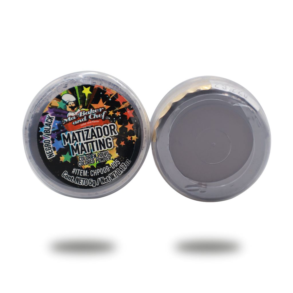 El Matizador en Polvo de Ma Baker and Chef lo podrá utilizar para matizar sobre Chocolate, Fondant, Pasta de Goma, Royal Icing, etc. Disponible en presentación de 5g en color Negro Mate.