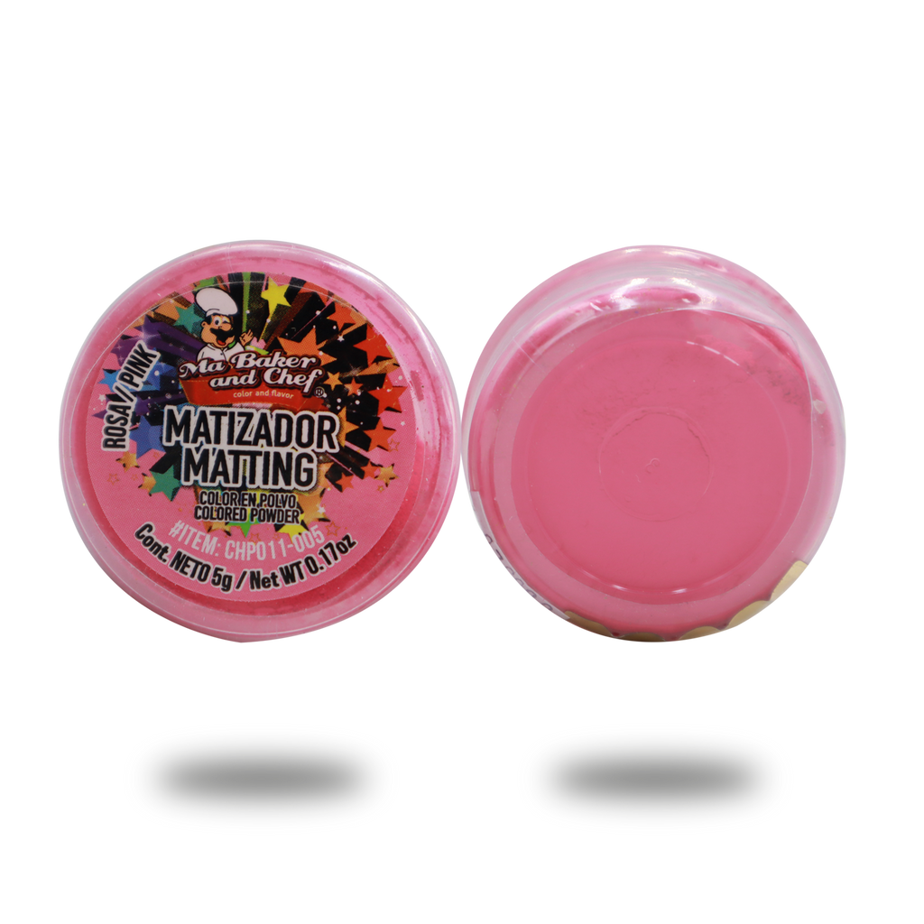 El Matizador en Polvo de Ma Baker and Chef lo podrá utilizar para matizar sobre Chocolate, Fondant, Pasta de Goma, Royal Icing, etc. Disponible en presentación de 5g en color Rosa Mate.