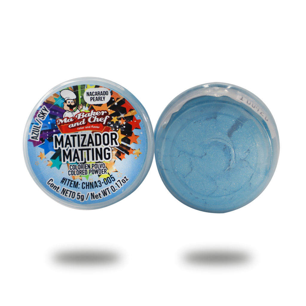 El Matizador en Polvo de Ma Baker and Chef lo podrá utilizar para matizar sobre Chocolate, Fondant, Pasta de Goma, Royal Icing, etc. Disponible en presentación de 5g en color Azul Cielo Aperlado.