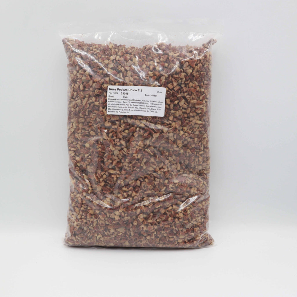 Nuez troceada en Pedazos Chico, de color marmolado característico de la especie, empleada en Repostería para Decorar y Agregar Texturas, también se usa para acompañar ensaladas y cócteles.