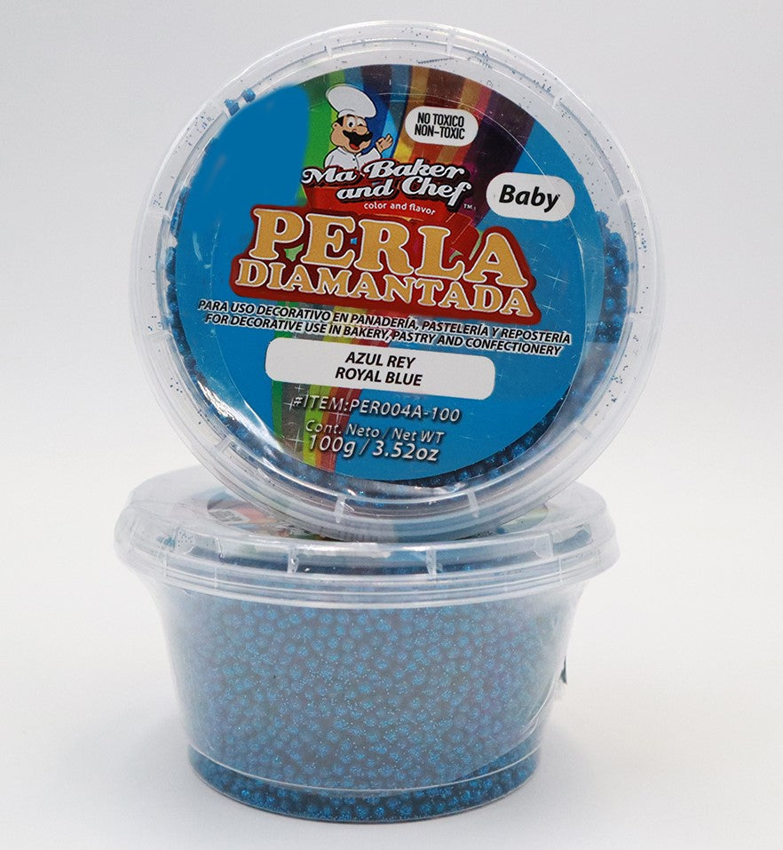 La Perla Diamantada de Ma Baker and Chef está hecha a base azúcar, le ayudara a decorar sus creaciones de manera novedosa, por su toque diamantado es utilizada solo para uso decorativo, no comestible. Disponible en presentación de 100g de tamaño Baby en color Azul Rey.