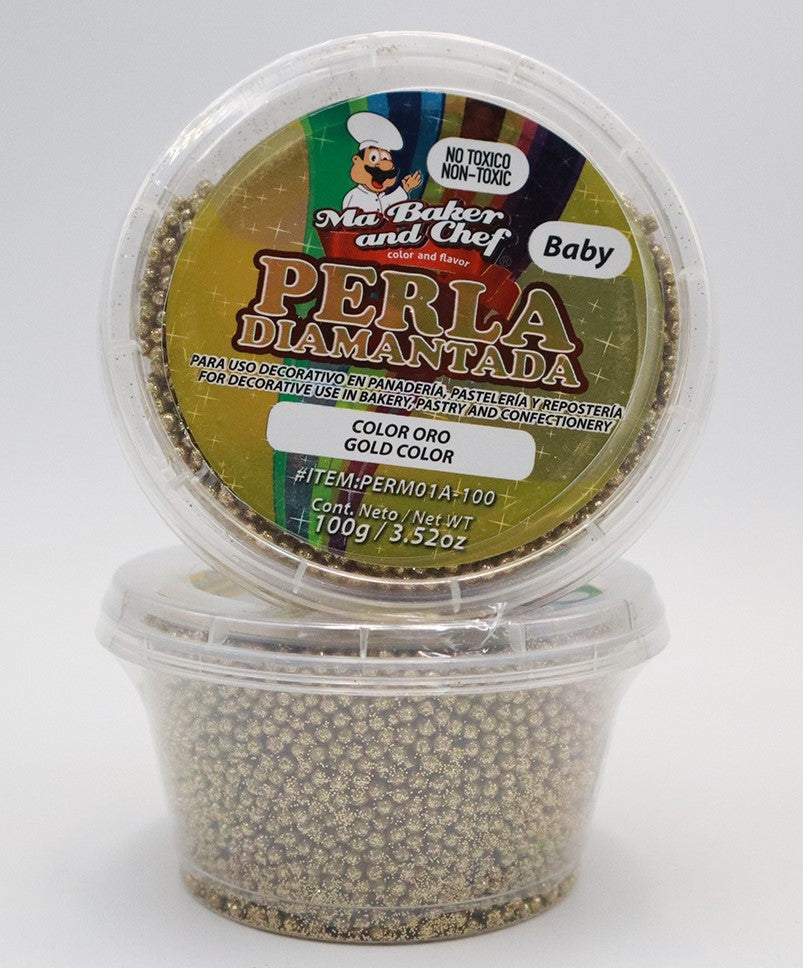 La Perla Diamantada de Ma Baker and Chef está hecha a base azúcar, le ayudara a decorar sus creaciones de manera novedosa, por su toque diamantado es utilizada solo para uso decorativo, no comestible. Disponible en presentación de 100g de tamaño Baby en color Oro.