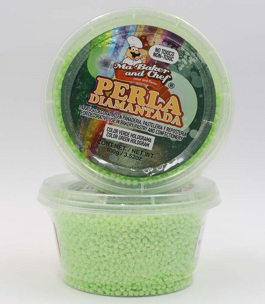 La Perla Diamantada de Ma Baker and Chef está hecha a base azúcar, le ayudara a decorar sus creaciones de manera novedosa, por su toque diamantado es utilizada solo para uso decorativo, no comestible. Disponible en presentación de 100g de tamaño Baby en color Verde Holograma.