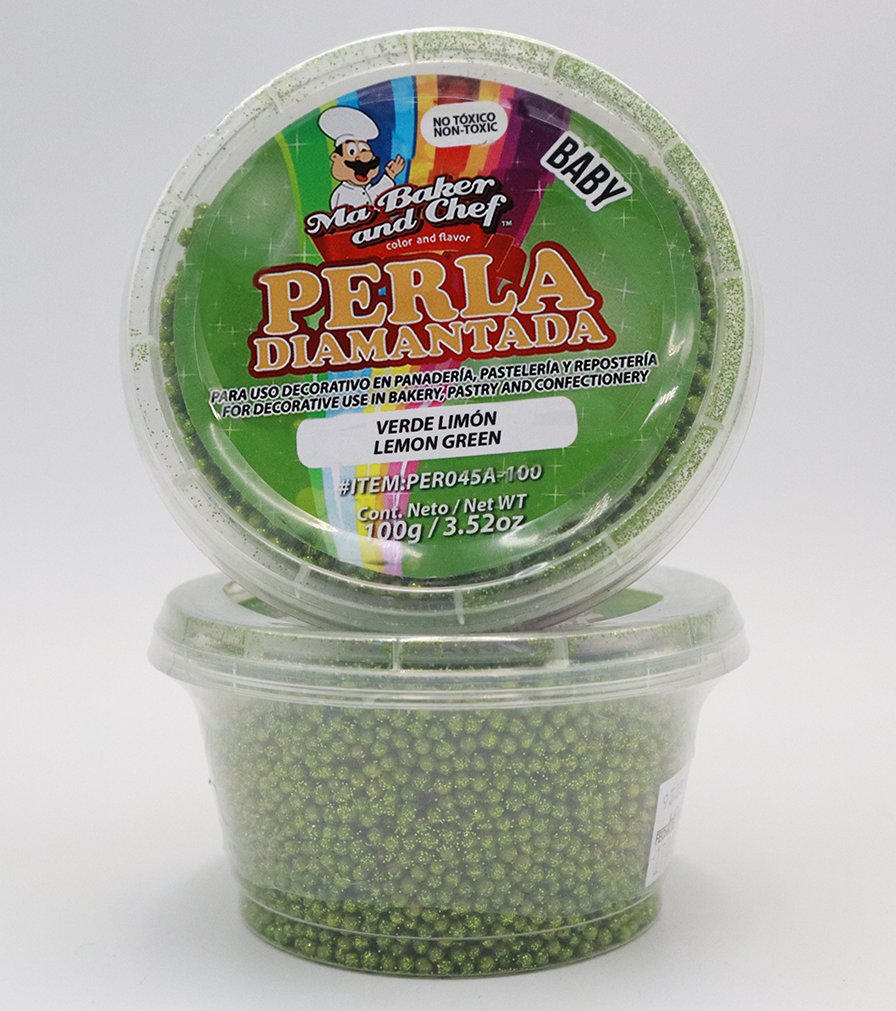 La Perla Diamantada de Ma Baker and Chef está hecha a base azúcar, le ayudara a decorar sus creaciones de manera novedosa, por su toque diamantado es utilizada solo para uso decorativo, no comestible. Disponible en presentación de 100g de tamaño Baby en color Verde Limón.