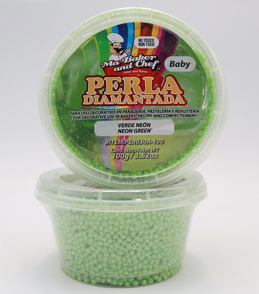 La Perla Diamantada de Ma Baker and Chef está hecha a base azúcar, le ayudara a decorar sus creaciones de manera novedosa, por su toque diamantado es utilizada solo para uso decorativo, no comestible. Disponible en presentación de 100g de tamaño Baby en color Verde Neón.