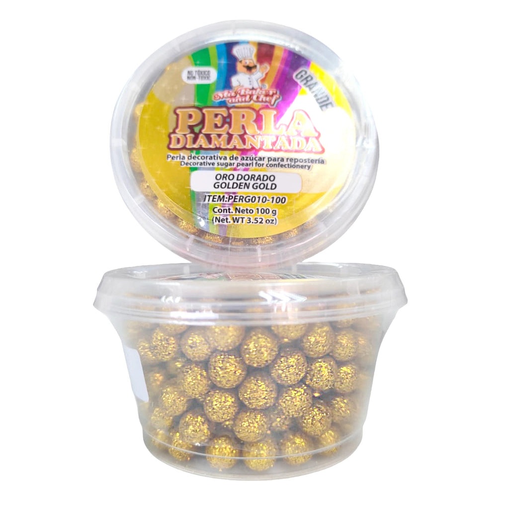 La Perla Diamantada de Ma Baker and Chef está hecha a base azúcar, le ayudara a decorar sus creaciones de manera novedosa, por su toque diamantado es utilizada solo para uso decorativo, no comestible. Disponible en presentación de 100g de tamaño Grande en color Oro Dorado.