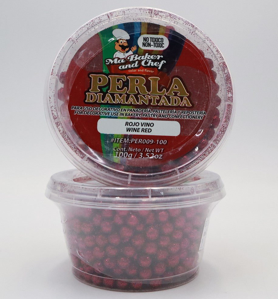 La Perla Diamantada de Ma Baker and Chef está hecha a base azúcar, le ayudara a decorar sus creaciones de manera novedosa, por su toque diamantado es utilizada solo para uso decorativo, no comestible. Disponible en presentación de 100g de tamaño Mediana en color Rojo Vino.
