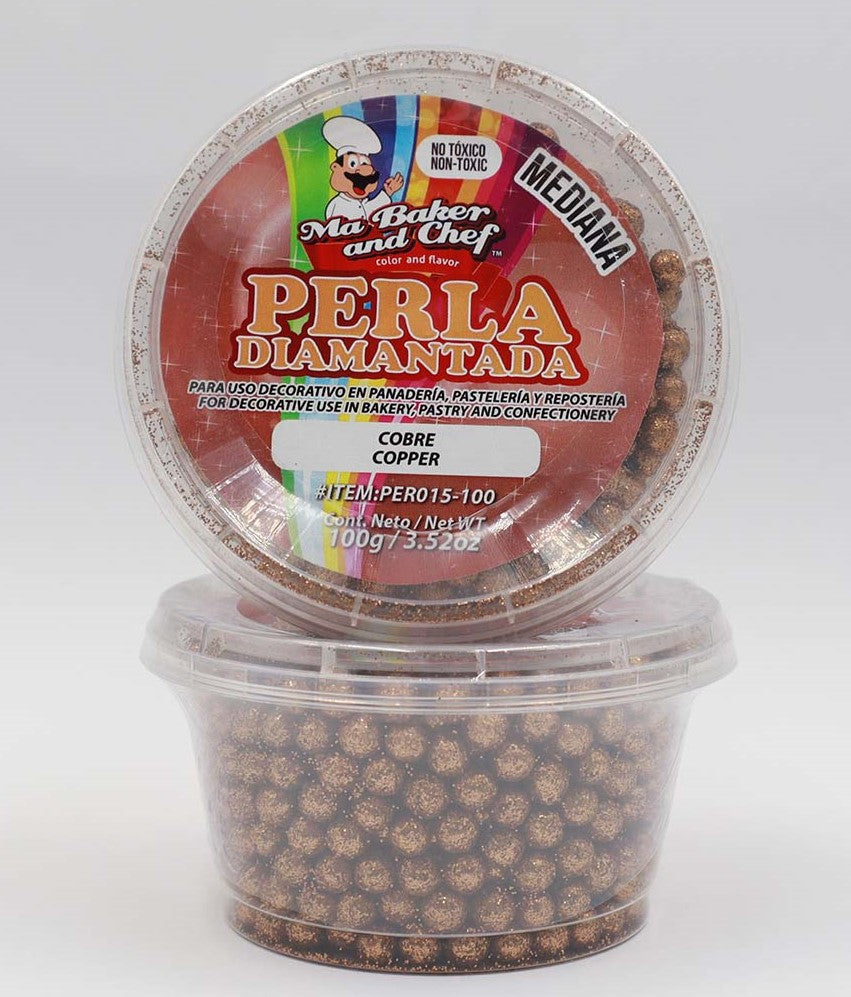La Perla Diamantada de Ma Baker and Chef está hecha a base azúcar, le ayudara a decorar sus creaciones de manera novedosa, por su toque diamantado es utilizada solo para uso decorativo, no comestible. Disponible en presentación de 100g de tamaño Mediana en color Cobre.