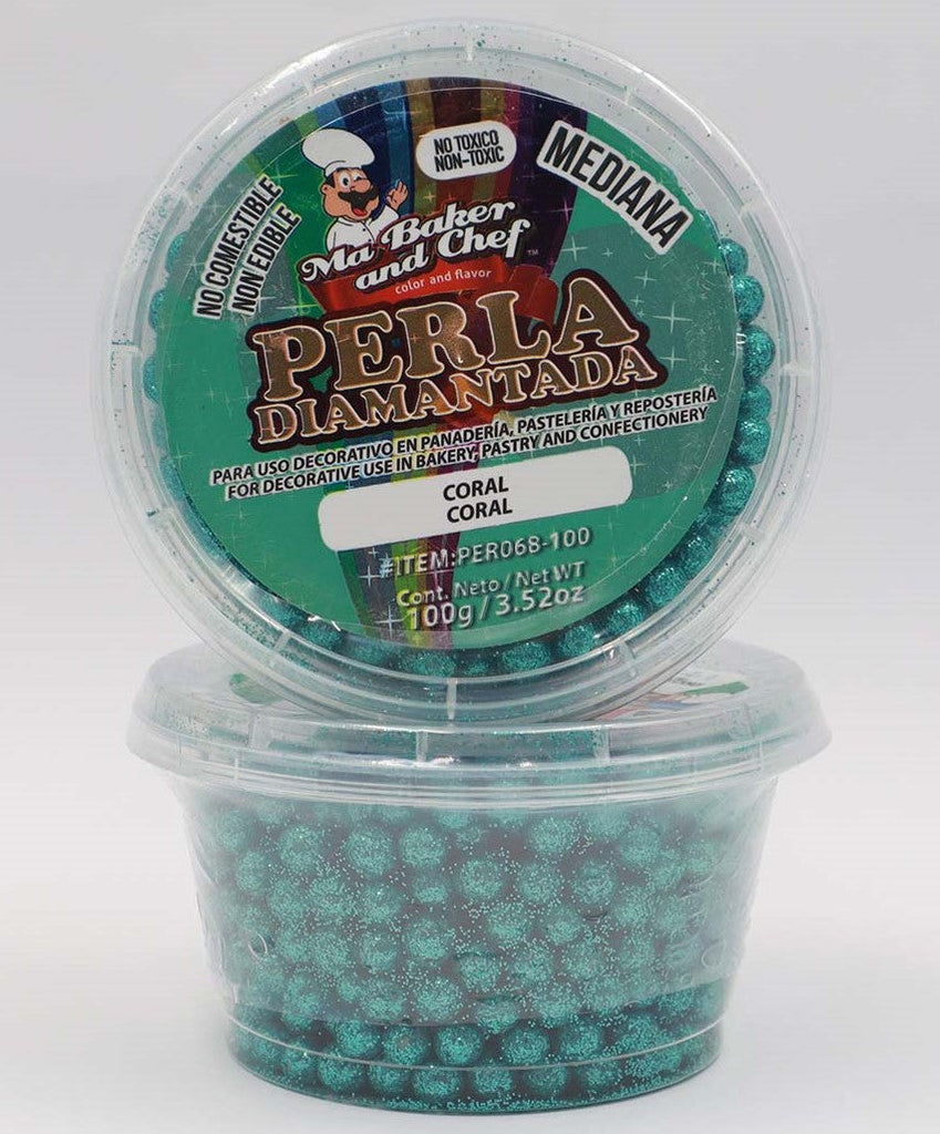 La Perla Diamantada de Ma Baker and Chef está hecha a base azúcar, le ayudara a decorar sus creaciones de manera novedosa, por su toque diamantado es utilizada solo para uso decorativo, no comestible. Disponible en presentación de 100g de tamaño Mediana en color Coral.
