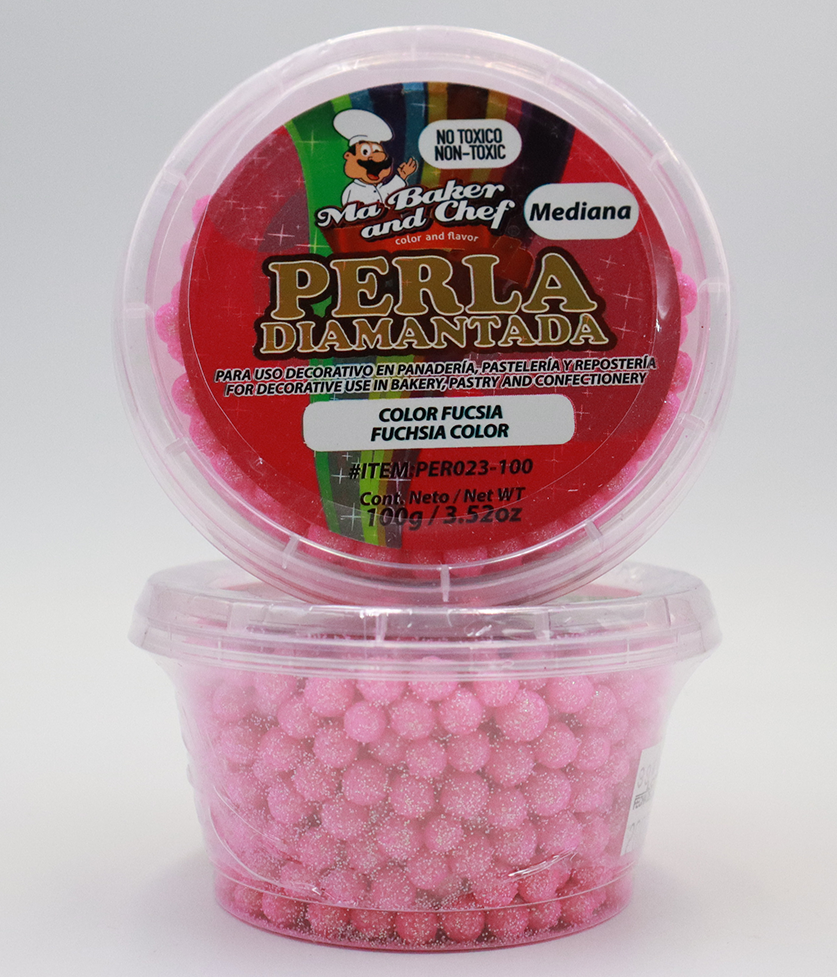 La Perla Diamantada de Ma Baker and Chef está hecha a base azúcar, le ayudara a decorar sus creaciones de manera novedosa, por su toque diamantado es utilizada solo para uso decorativo, no comestible. Disponible en presentación de 100g de tamaño Mediana en color Fucsia.