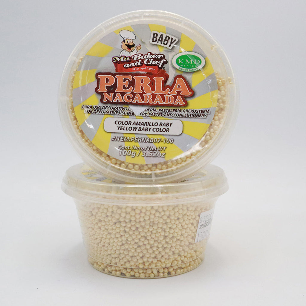La Perla Nacarada de Ma Baker and Chef está hecha a base de azúcar, le ayudara a decorar sus creaciones de manera novedosa, la podrá utilizar para acabado nacarados es 100% comestible. Disponible en presentación de 100g de tamaño Baby en color Amarillo Baby.