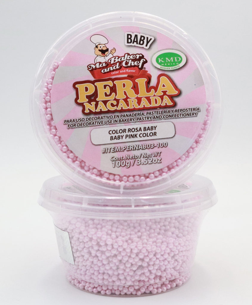 La Perla Nacarada de Ma Baker and Chef está hecha a base de azúcar, le ayudara a decorar sus creaciones de manera novedosa, la podrá utilizar para acabado nacarados es 100% comestible. Disponible en presentación de 100g de tamaño Baby en color Rosa Baby.