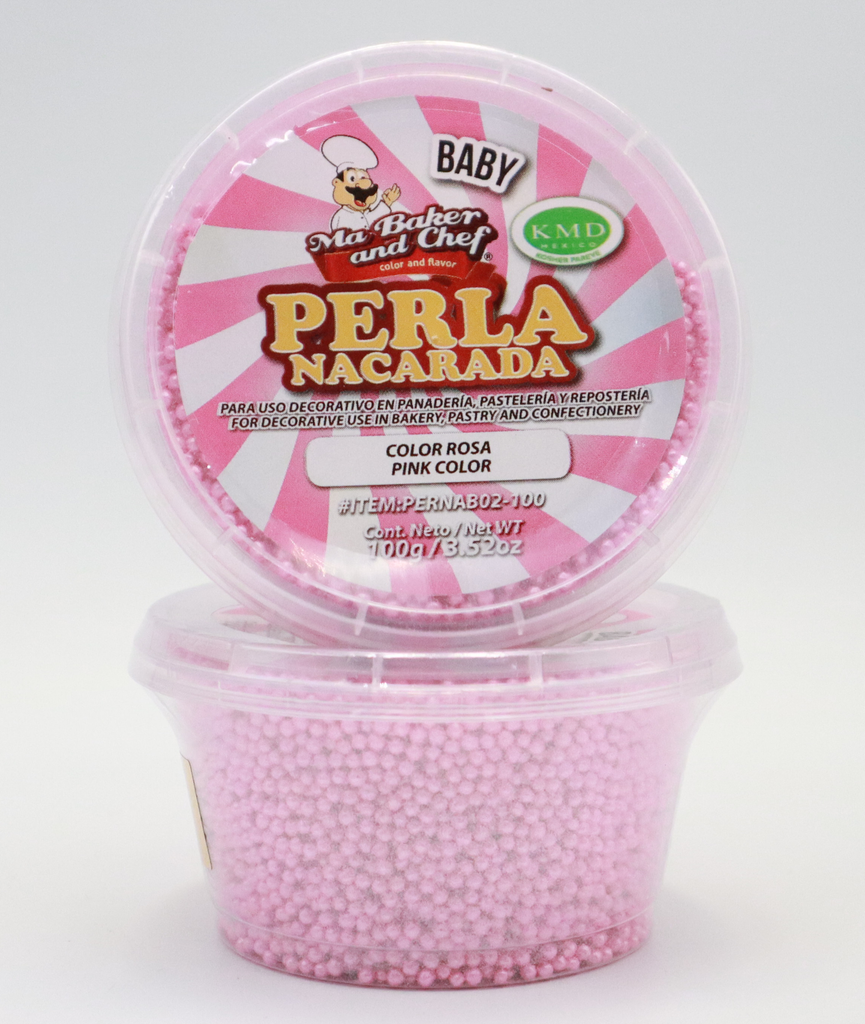 La Perla Nacarada de Ma Baker and Chef está hecha a base de azúcar, le ayudara a decorar sus creaciones de manera novedosa, la podrá utilizar para acabado nacarados es 100% comestible. Disponible en presentación de 100g de tamaño Baby en color Rosa.