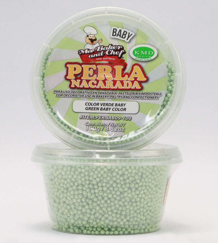 La Perla Nacarada de Ma Baker and Chef está hecha a base de azúcar, le ayudara a decorar sus creaciones de manera novedosa, la podrá utilizar para acabado nacarados es 100% comestible. Disponible en presentación de 100g de tamaño Baby en color Verde Baby.