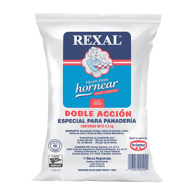 REXAL es el polvo para hornear doble acción que te ofrece el esponjado ideal para tus pasteles, tus tortillas de harina y un sinfín de otros platillos, además de ser un aliado para obtener un capeado perfecto. Lo puedes encontrar en presentaciones para todos los días como la bolsa de 4.5kg, que tiene el tamaño y el peso ideal para ser manipulada en laboratorios de panadería y en cocinas profesionales.