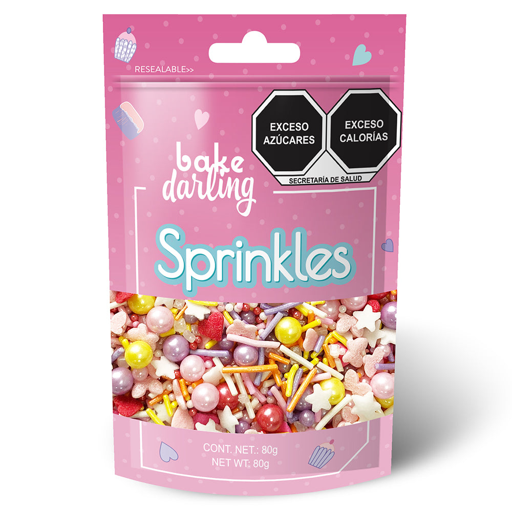 Sprinkles con perlas nacaradas, maripositas, corazones y granillos, en bolsa resellable de 80 gr, ideal para decorar pasteles, cupcakes y creaciones de reposteria.