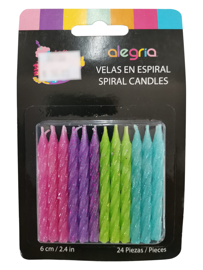 Impresiona a tus invitados con el mejor pastel de la fiesta con las Velas en Espiral. Son ideales para que los invitados queden fascinados ya que sus 24 velas son perfectas para utilizar en toda ocasión. Estan diseñadas de color Rosa, Morado, Verde y Azul con Brillos que le encantara al festejado.